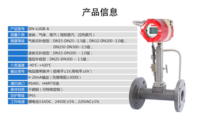 LUGB-SIN-A高精度渦街流量計對過熱蒸汽、飽和蒸汽、壓縮空氣和一般氣體、水和液體的計量和控制。加厚本體,可有效避免現(xiàn)場管道振動帶來的數(shù)據(jù)波動和誤差。