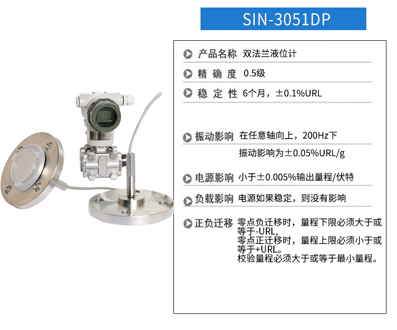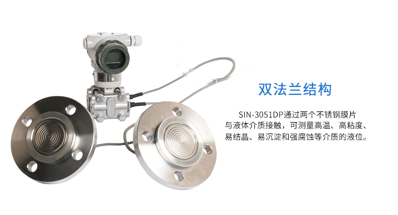 SIN-3051DP雙法蘭差壓液位變送器是一種為避免被測(cè)介質(zhì)直接作用于變送器的遠(yuǎn)傳隔離膜片接觸而采用的差壓式變送器(結(jié)構(gòu)測(cè)量法)。